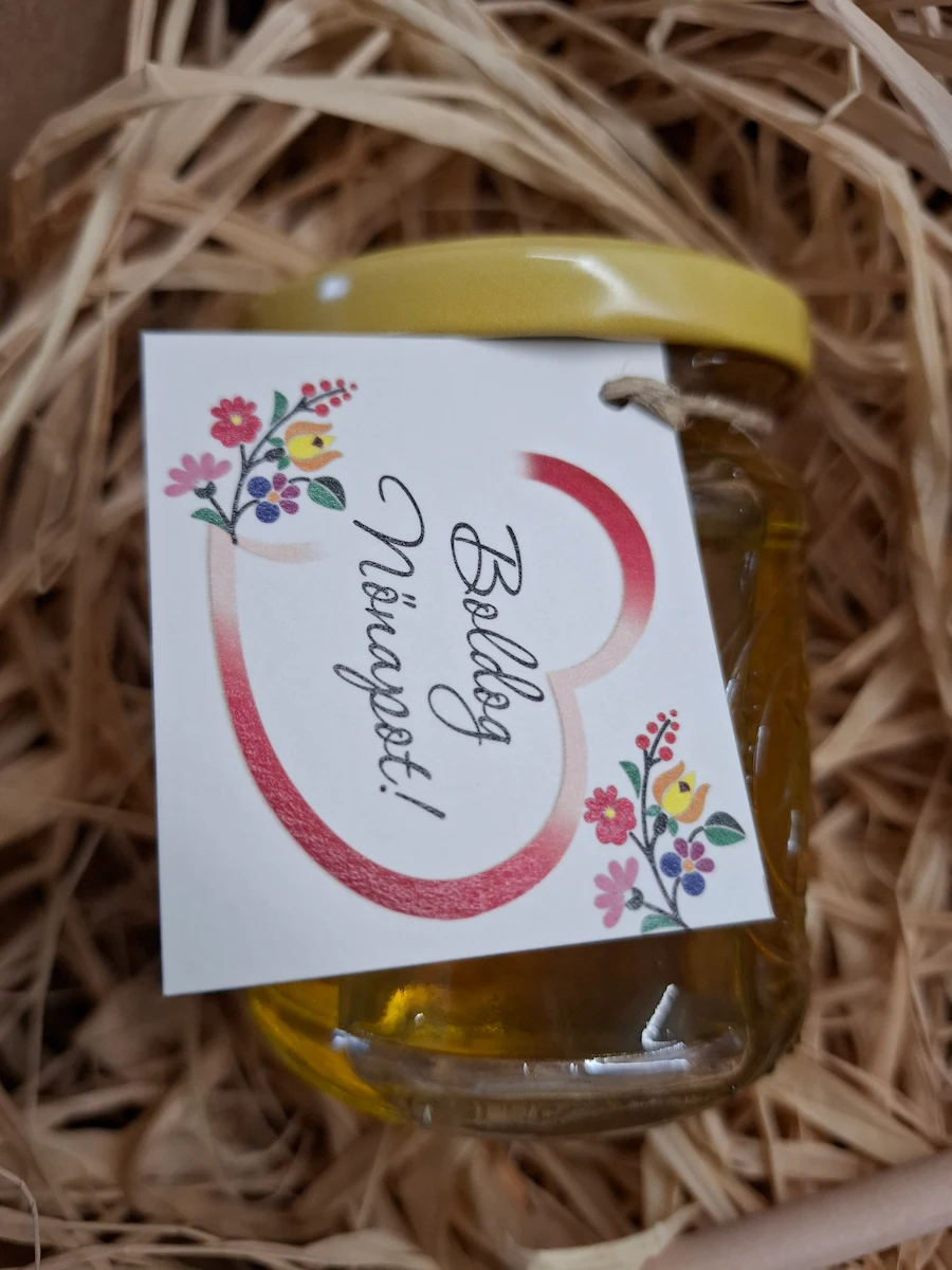 Egyedi nőnapi címkés akácméz, két természetes viaszgyertya –